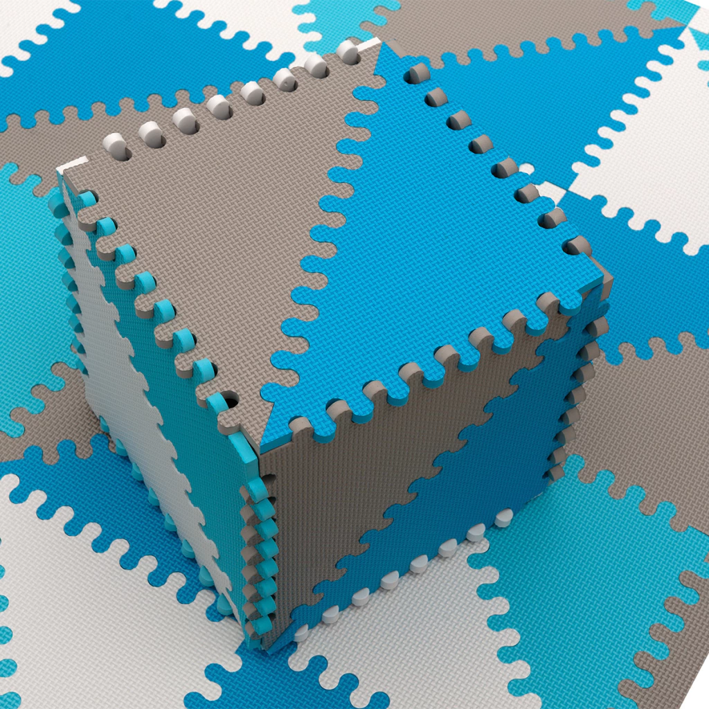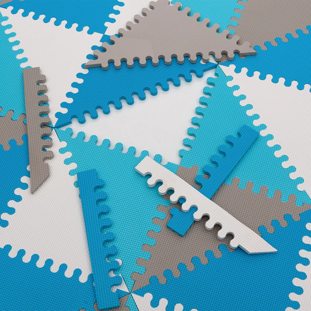 Transformá tu espacio en minutos con este piso de goma EVA estilo nórdico. Su diseño triangular en tonos arena y blanco crea una base segura, acolchada y visualmente armónica para que los más peques jueguen, gateen o exploren sin frío ni golpes.